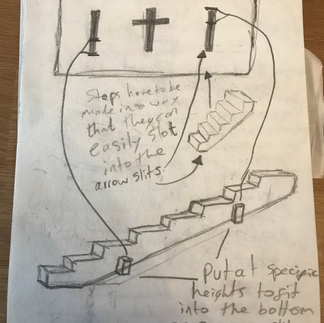 And this is where I really started to think like a designer I believe, taking these ideas and making everything fit into each other, making for better play.. the poles fit into everything with holes which are the, rope ends, the wooden planks, the cogs and the holes in the buildings themselves. and everything that screws/fixes anything, can fit through the holes too. And through this process, thought, maybe the ladders and planks should be able to fit into each other too.. and so the ladders fit into the rectangle slits in the side of the 'beams', and they both fit into the arrow slits on the buildings themselves.